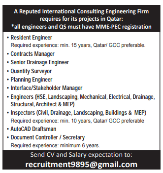 Required • Resident Engineer • Contracts Manager • Senior Drainage Engineer • Quantity Surveyor • Planning Engineer • Interface/Stakeholder Manager • Engineers (HSE, Landscaping, Mechanical, Electrical, Drainage, Structural, Architect & MEP) • Inspectors (Civil, Drainage, Landscaping, Buildings & MEP) Required experience: min. 10 years, Qatar/ GCC preferable • AutoCAD Draftsman • Document Controller / Secretary