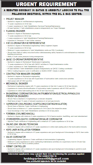URGENT REQUIREMENT • PROJECT MANAGER • PLANNING ENGINEER • HSE CO-ORDINATOR/HSE REPRESENTATIVE • QA/QC CO-ORDINATOR/REPRESENTATIVE • CONSTRUCTION MANAGER/ ENGINEER • MECHANICAL ENGINEER • ENGINEERING COORDINATOR/CIVIL/INSTRUMENTATION/ELECTRICAL/PIPING/LOSS PREVENTION ENGINEERS • SUPERVISOR (CIVIL/RIGGING /SCAFFOLDING/COATING/INSULATION) • FOREMAN (CIVIL/MECHANICAL) • STOREKEEPER/LOGISTIC COORDINATOR/VALVE COORDINATOR • ONLINE LEAK SEALING TECHNICIAN • HDPE LINER INSTALLATION FOREMAN • VALVE COORDINATOR • PERMIT CONTROLLER