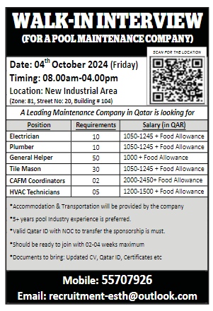 A Leading Steel Fabrication Company in Qatar is looking for ELECTRICIAN/PLUMBER/GENERAL HELPER/TILE MASON/CAFM COORDINATORS/HVAC TECHNICIANS