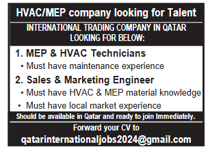 HVAC/MEP company looking for Talent INTERNATIONAL TRADING COMPANY IN QATAR LOOKING FOR BELOW 1. MEP & HVAC Technicians 2. Sales & Marketing Engineer