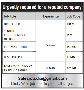 Urgently required for a reputed company HR OFFICER5 YearsHR-MGSENIORPROCUREMENT OFFICER P-MJPROΈMANDOOBΉPR-MGIT SPECIALISTIT-MGSALES MANΈIN DOORΉEGYPTIANS ONLYA