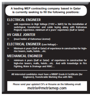 ELECTRICAL ENGINEER HV CABLE JOINTER ELECTRICAL ENGINEER MECHANICAL ENGINEER