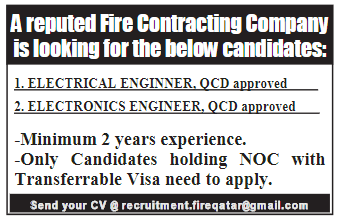 A reputed Fire Contracting Company is looking for the below candidates 1. ELECTRICAL ENGINNER, QCD approved 2. ELECTRONICS ENGINEER, QCD approved