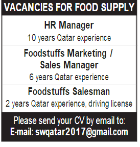 VACANCIES FOR FOOD SUPPLY HR Manager Foodstuffs Marketing / Sales Manager Foodstuffs Salesman