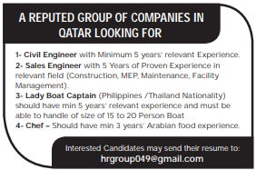Required 1- Civil Engineer 2- Sales Engineer 3- Lady Boat Captain 4- Chef
