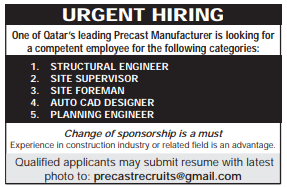 URGENT HIRING 1. STRUCTURAL ENGINEER 2. SITE SUPERVISOR 3. SITE FOREMAN 4. AUTO CAD DESIGNER 5. PLANNING ENGINEER