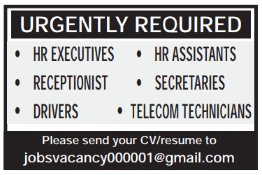 Required l HR EXECUTIVES l HR ASSISTANTS l RECEPTIONIST l SECRETARIES l DRIVERS l TELECOM TECHNICIANS