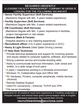 Required • Senior Facility Supervisor (Soft Services) • Facility Supervisor (Soft Services) • FM Coordinator (Soft Services) • Cleaners (Male & Female) • Recruitment officer • Heavy & Light Drivers • IT Help Desk Technician
