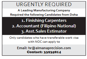Required 1. Finishing Carpenters2. Accountant (Filipino National)3. Asst.Sales Estimator