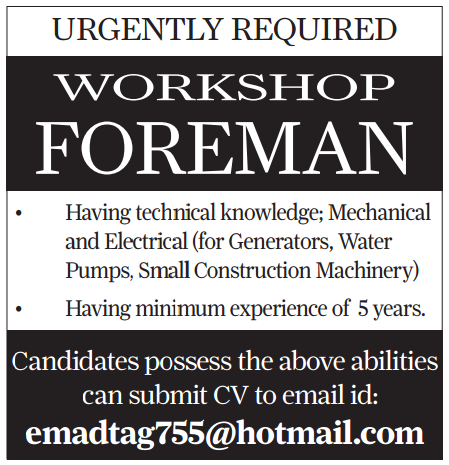 URGENTLY REQUIRED WORKSHOP FOREMAN